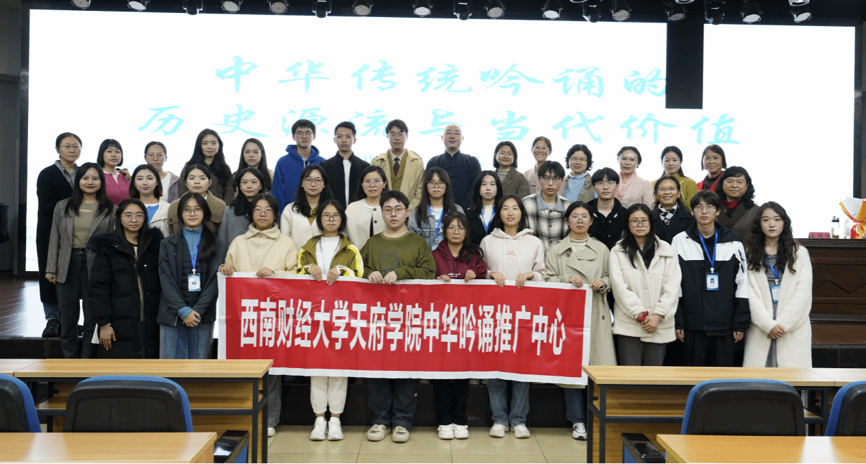 11月12日晚,由马克思主义学院主办、西财天府中华吟诵推广中心承办的“中华传统吟诵的历史源流与当代价值”主题讲座在绵阳校区学术报告厅举行。讲座邀请中华吟诵学会理事、四川省吟诵学会会长、四川省非物质文化遗产“四川吟诵”代表性传承人、西财天府中华吟诵推广中心学术总顾问王传闻先生主讲,马克思主义学院教师罗颖主持,四川传统文化研究中心负责人沈德存老师、绵阳市吟诵学会成员代表、马克思主义学院教师及学生共计500余人参与。
