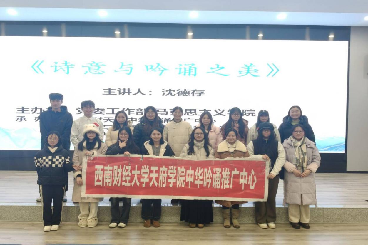 1月7日,由学校党委工作部、马克思主义学院主办,西财天府中华吟诵推广中心、文化与教育学院党建服务中心、文化与教育学院团总支、学生会承办的“诗意与吟诵之美”专题讲座在绵阳校区5206报告厅举行。本次活动邀请西南财经大学天府学院图书馆馆员,四川省吟诵学会理事、副秘书长,绵阳市吟诵学会理事沈德存担任主讲,共计100余名师生参加活动。